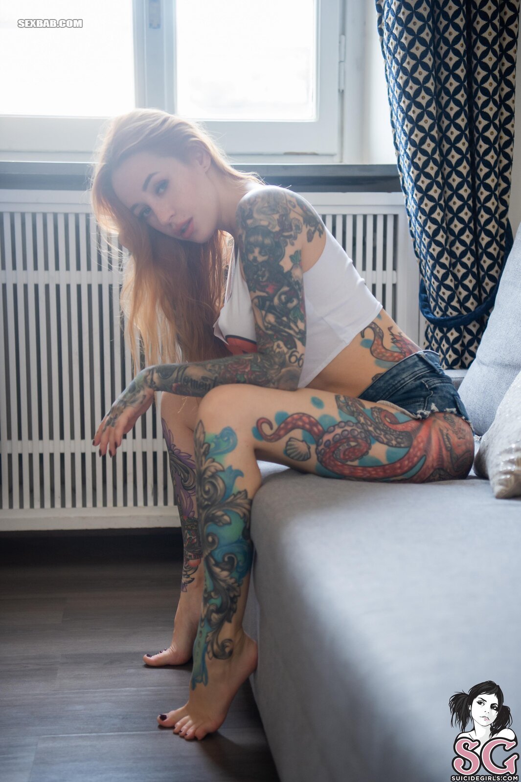 Растатуированная рыжая девушка обнажает своё красивое тело на подоконнике (10 фото)