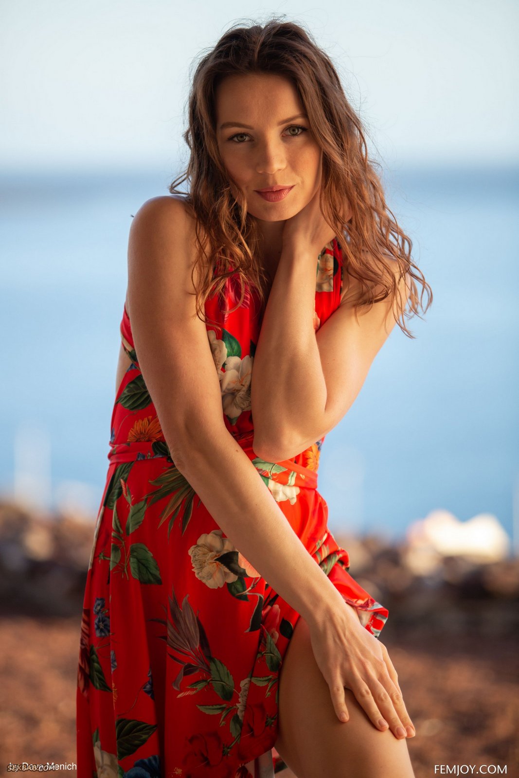 Описание: Страстно сорвав с себя яркое красное платье, голая женщина с плоскими сиськами и маленькими острыми сосками чувственно ласкает руками свое горячее тело и, извиваясь перед камерой в самых возбуждающих позах, интригующе засвечивает мельком между ножек свою бритую письку.