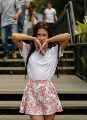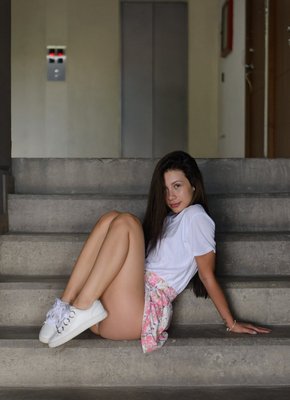 Описание: Обворожительная молодая девушка со стройной фигуркой и пухлыми губками гуляет на улице в короткой юбке и футболке, кокетливо позируя при этом перед фотографом с камерой. Страстно желая понравится нам с вами, сексуальная красавица позволяла взглянуть на её белые кружевные трусики под юбкой, для этого присаживаясь и раздвигая промежность.