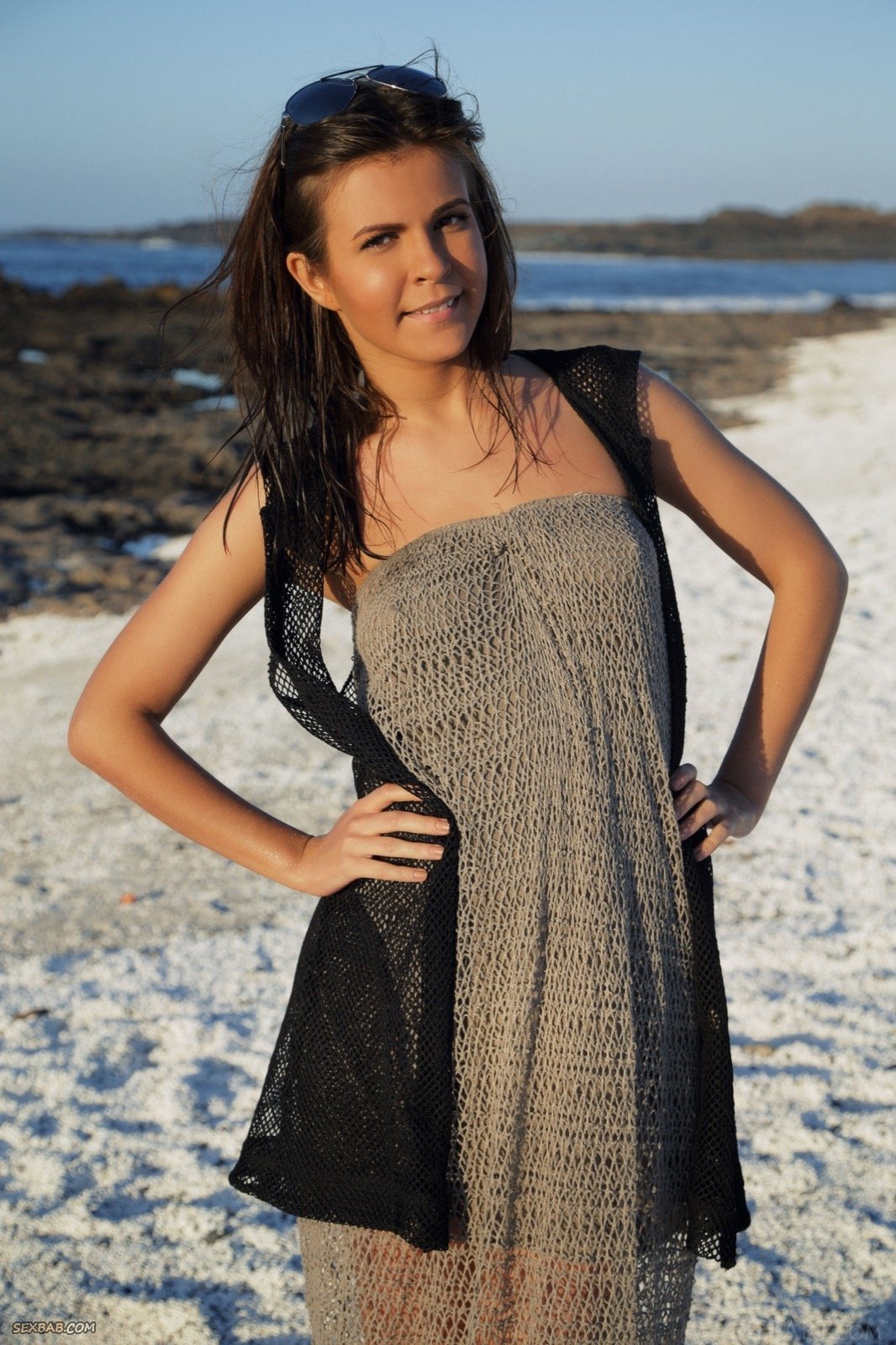 Описание: Скинув платье, полностью голая девушка начинает эротично позировать на море, порой забираясь в воду и ложась на животик оттопыривая сексуальную подкаченную попку. Таким образом мокрая красотка так же демонстрировала влажную бритую письку и маленькие торчащие сиськи с набрякшими сосочками.