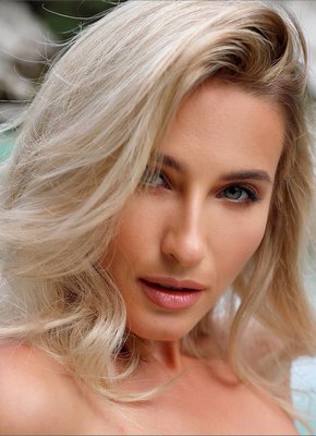 Ослепительная блондинка у горной речки