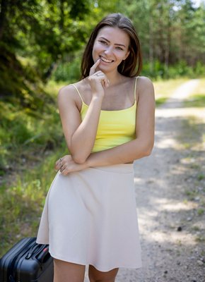 Описание: Решив немного разнообразить свой отдых, молодая путешественница кокетливо стянула с себя короткую юбку с маечкой и во всей красе показала бритую пиздёнку на проселочной дороге. Страстно извиваясь всем телом, деваха с натуральными прелестями перепробовала множество развратных поз и успешно показала на камеру свои самые интимные места.